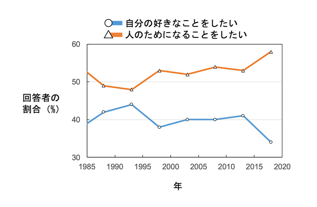 統計数理研究所が実施している「日本人の国民性調査」では、理想の生き方について次の2つから選択する設問があります。