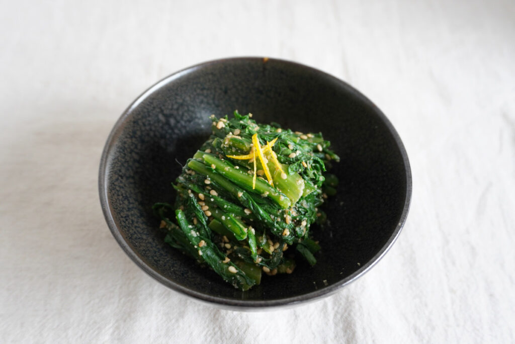 ボウルに水をため、春菊を根元からよく洗います。沸騰したお湯にまず茎を、次に葉を入れて1分ほど茹で、冷水に取ります。水気を軽く絞ってから、4~5cm長さに切ります。すり鉢にごまを入れ、半分ほど粒が残るくらいにすり、しょうゆ、砂糖を加えて全体を混ぜ、和え衣をつくります。春菊はもう一度水気を絞り、ほぐしながら和え衣に加え、全体を和えたら器に盛り付けます。今回は、仕上げにゆずの皮を添えました。香りよく、緑と黄の色合いもきれいです。