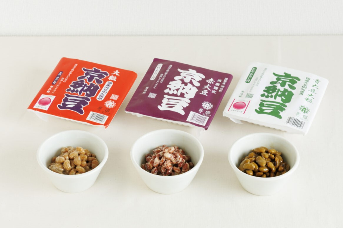 納豆の味を決めるのは、なんといっても大豆そのもの。おいしい納豆をつくるには、まず、大豆選びが肝心だという藤原さん。定番の大粒、小粒に加え、青や赤など、豆を生かした数種類の納豆がつくられています。豆の味わい、そして種類ごとのちがいを楽しめるのは、京納豆の大きな魅力です。