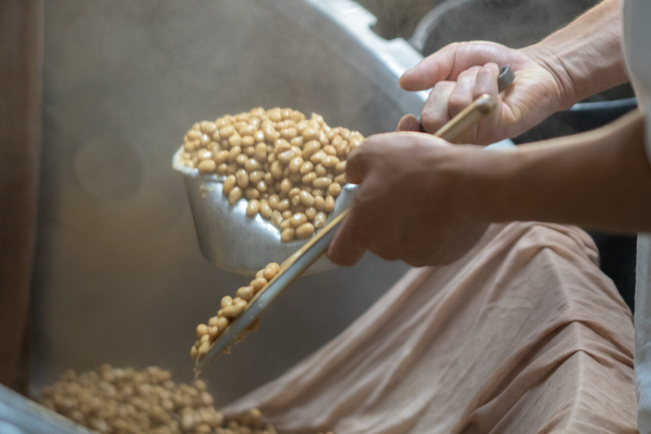 まず行うのが、大豆の浸水。春夏秋冬、季節によって、また気温や水温、湿度によって浸水時間を細かく調整します。十分に浸かっていないとできあがりが固くなり、浸かりすぎると納豆菌がうまく働かず糸が引かなくなる。浸水は、工程のなかで一番気を引き締めるところなのだそう。