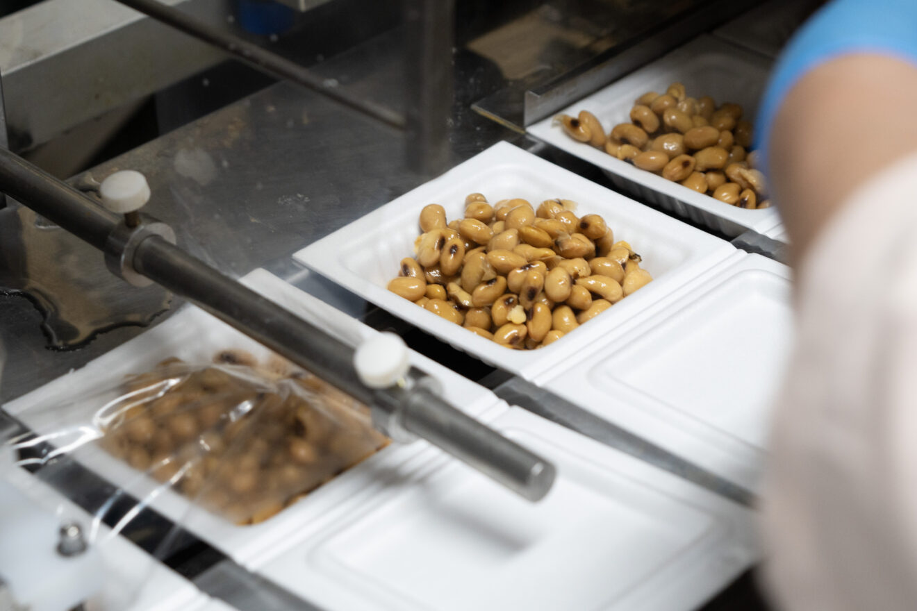 そして、パック詰め。蒸した大豆を詰める人、フィルムを押さえてたれと辛子を入れる人、閉じられたパックをコンテナに詰める人。専用の機械の前にスタッフのみなさんが並び、てきぱきと手を動かします。
