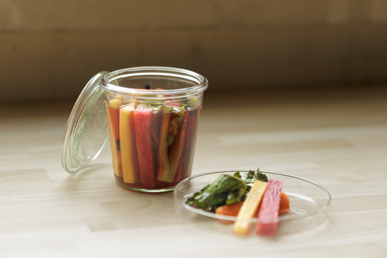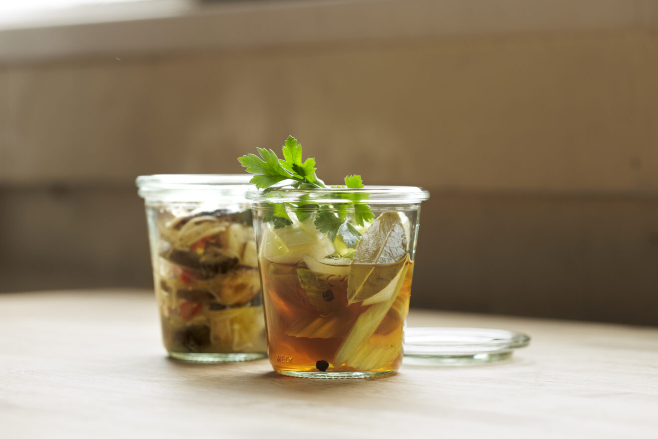 晩ごはんの余りものや、休日に作り置きするおかず。WECKのガラス容器に入れれば、きのこのマリネも、セロリのピクルスも、ひじきの煮物や、青菜のごま和えだって、すてきな瓶詰めのよう。見た目の揃った瓶で、冷蔵庫内がすっきり整います。
