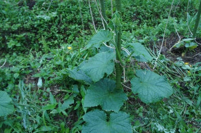 きゅうりネットを張ると、刈払い機で草を刈るのが難しくなってしまうので、なんとかネットを使わずにできないかと試行錯誤しています。