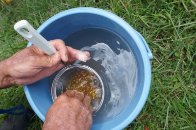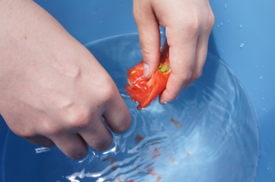 完熟させたトマトを割り、水の中で種をこそげていきます。
