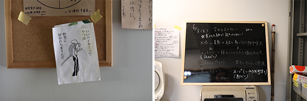 oikazeごはん当日、私たちは朝9時に坂ノ途中さんのオフィスを訪ねました。空は白い雲に覆われていますが、向かいの公園ではお父さんと子どもが楽しそうにキャッチボールをしています。お台所がある2階へと階段を上がっていくと、色とりどりの野菜が並んだ調理台はすでに優しい香りに包まれていました。友人の家にお呼ばれした時のような気分で台所にお邪魔すると、あちこちに見たことのない野菜やユニークな手書きの標語があり、何からお話を聞いてよいのか戸惑う程です。