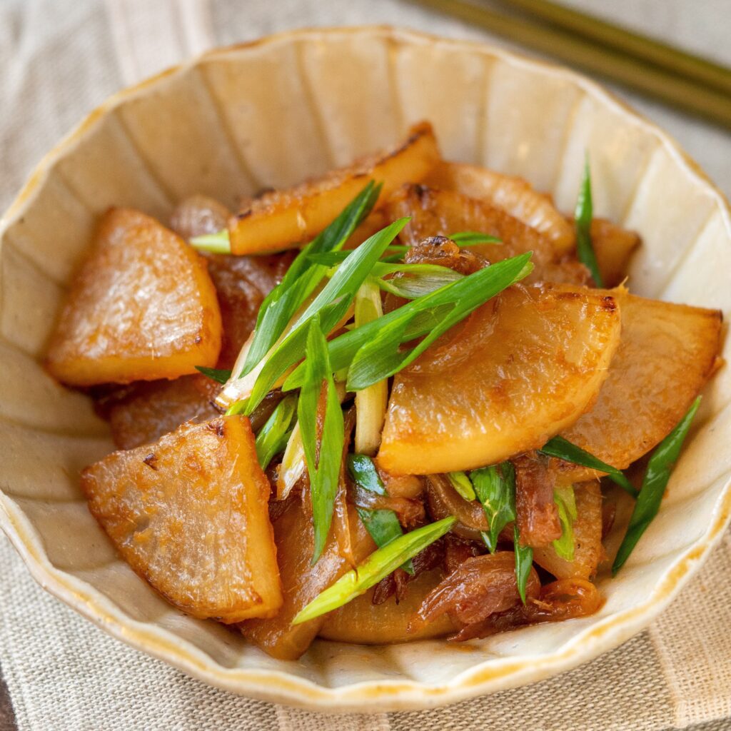 3)フライパンにサラダ油を入れて熱し、大根、たまねぎを入れて5分ほど炒めます。大根が柔らかくなったら合わせ調味料を加え、水分が飛ぶまで煮絡めます。器に盛り、青ねぎを散らします。