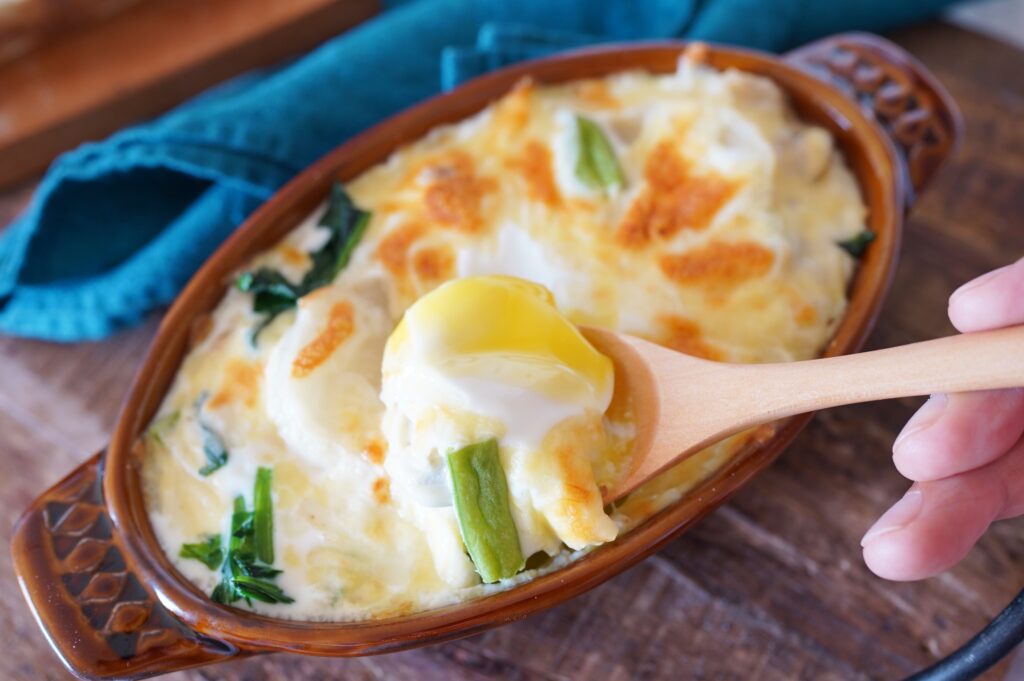 寒い日にぴったりのグラタンに入れて、じっくり焼きました。