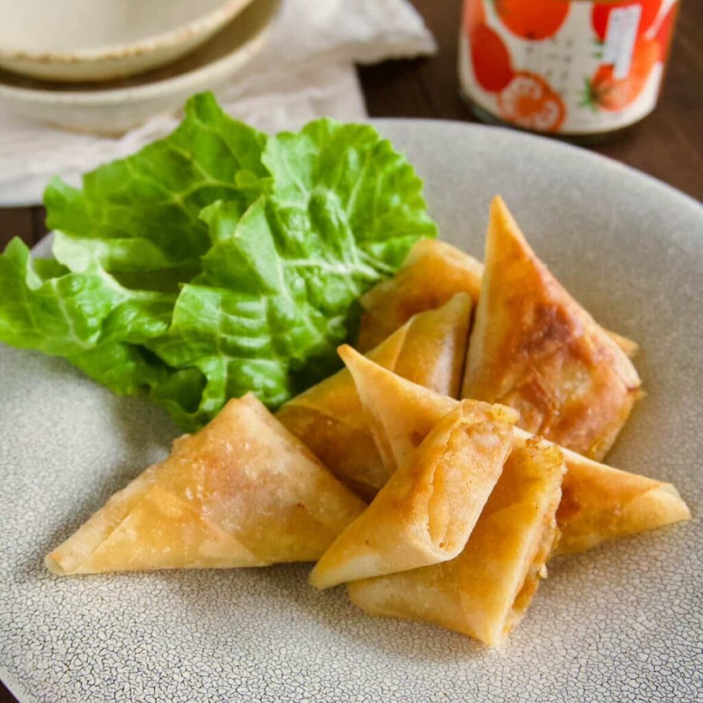 坂ノ途中のオリジナル商品、「トマトのスパイス混ぜごはん」を使ったアレンジレシピを、アンバサダーさんに考えていただきました。スパイシーな香りから連想したというサモサ。春巻きの皮を使うので手軽につくれます。じゃがいもを潰したり、皮を巻いたりする作業は、お子さんと一緒にやってみても。