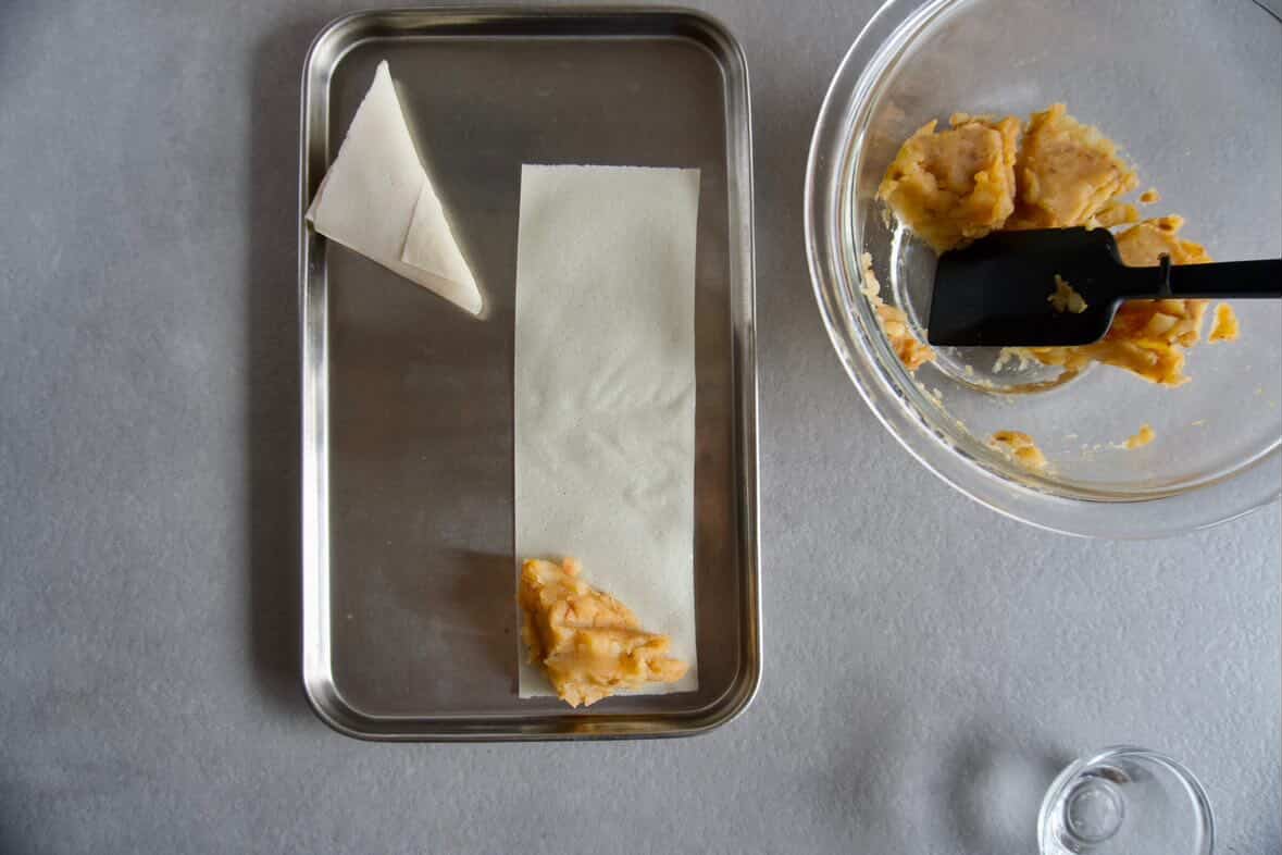 3)春巻きの皮を3等分に切ります。2を端に置き、三角になるように巻いていきます。いちばん最後は水をつけてとじます(とじにくい場合は、薄力粉小さじ1、水小さじ1を混ぜて、のりにしてください)。