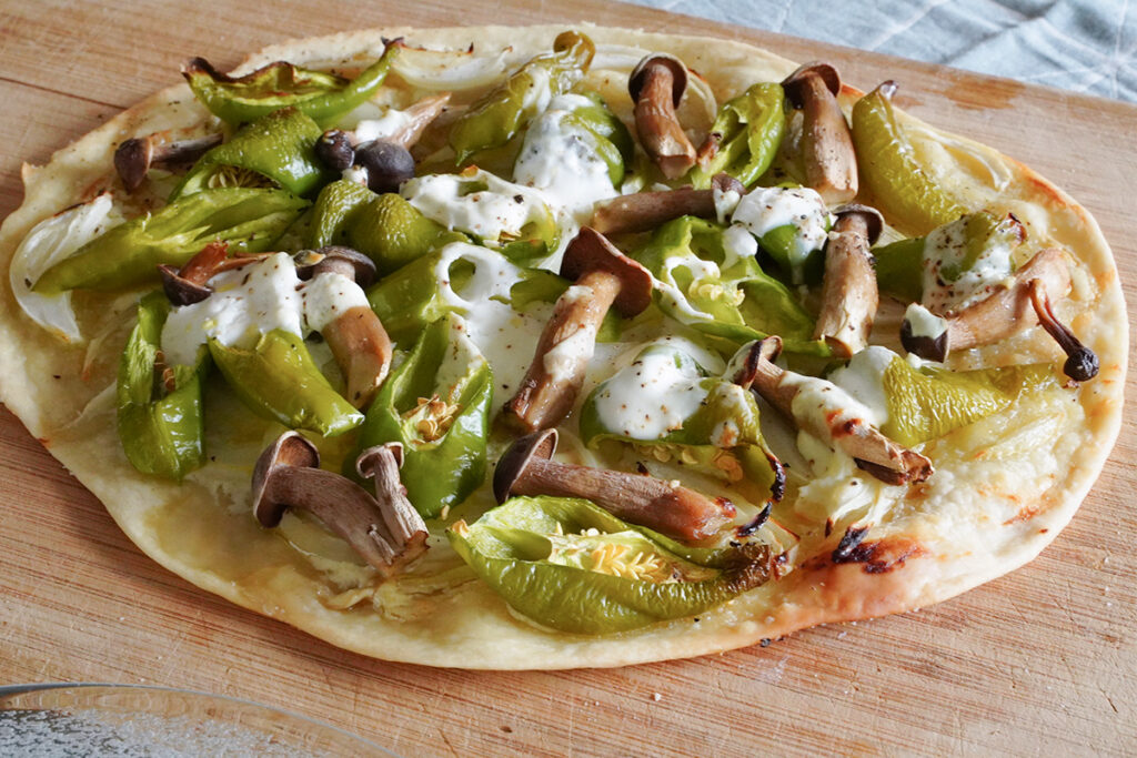 4)それぞれの生地にサワークリームを塗ります。万願寺とうがらし、玉ねぎ、はたけしめじをのせ、全体に塩、こしょうをふります。オリーブオイル各大さじ1をまわしかけます。お好みでサワークリームを追加トッピングしてもおいしいです(今回は1枚につき、大さじ1程度加えました)。
