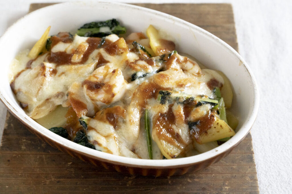 3)耐熱容器に2を入れ、その上にソースをかけ、チーズをのせて180℃のオーブンで焼き目がつくまで約5分焼きます。