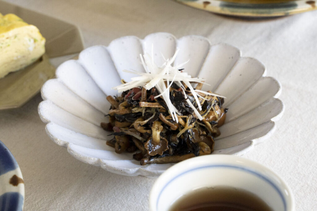 2)フライパンにごま油を入れ中火にかけ、なめこを入れてさっと炒めます。白ねぎ、ひじき、酒を加え、さっと炒めます。しょうゆを加えてしんなりするまで炒めたら、梅干しを加えます。