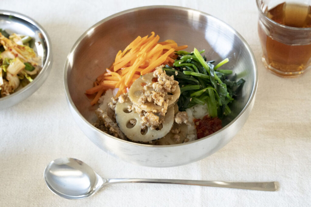 4)器にごはんを盛り、にんじんのナムル、ほうれん草のナムル、れんこんそぼろをのせ、コチュジャンを添えます。