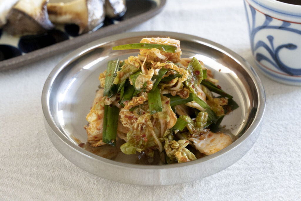 即席のキムチサラダ「コッチョリ」をヒントにつくりました。はくさいの甘味、ニラの香りをたのしみます。
