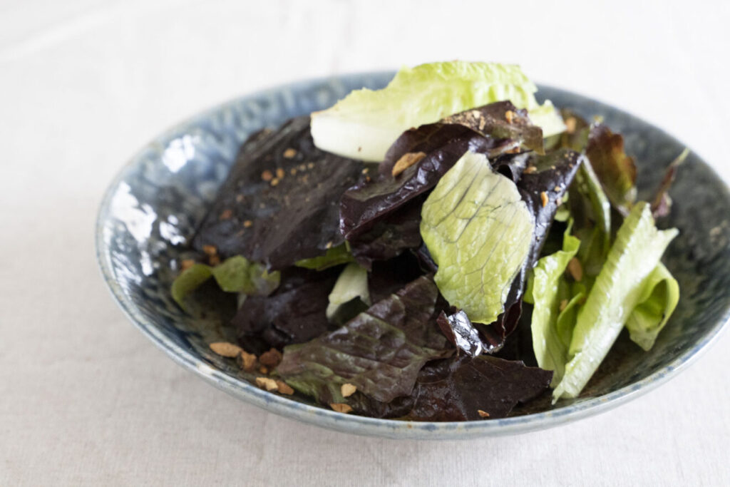 1)ロメインレタスを食べやすい大きさにちぎります。アーモンドは袋に入れて、めん棒などでたたき、細かくつぶしておきます。温州みかんは果汁をしぼっておきます。