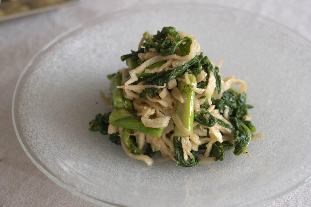 ほろ苦く甘い菜の花にあわせるのは、味噌とオリーブオイル。切り干し大根のコリコリとした食感もきいています。