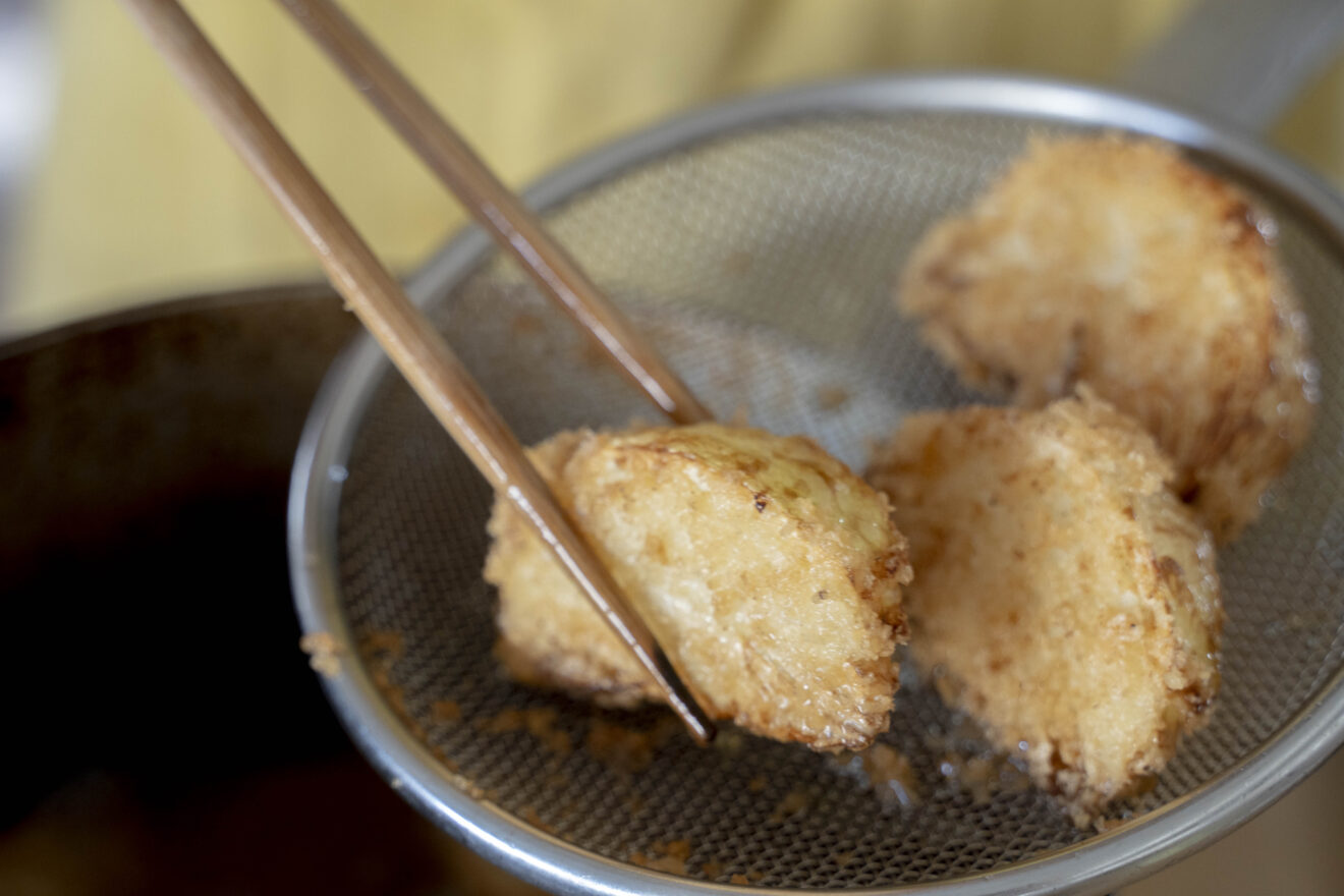 まずはごはんを炊き、味噌汁をつくっておきます。卵を茹でて、タルタルソースをつくり、ザワークラウト風キャベツをつくります。食べる時間に合わせて、新玉ねぎに衣をつけて揚げます。