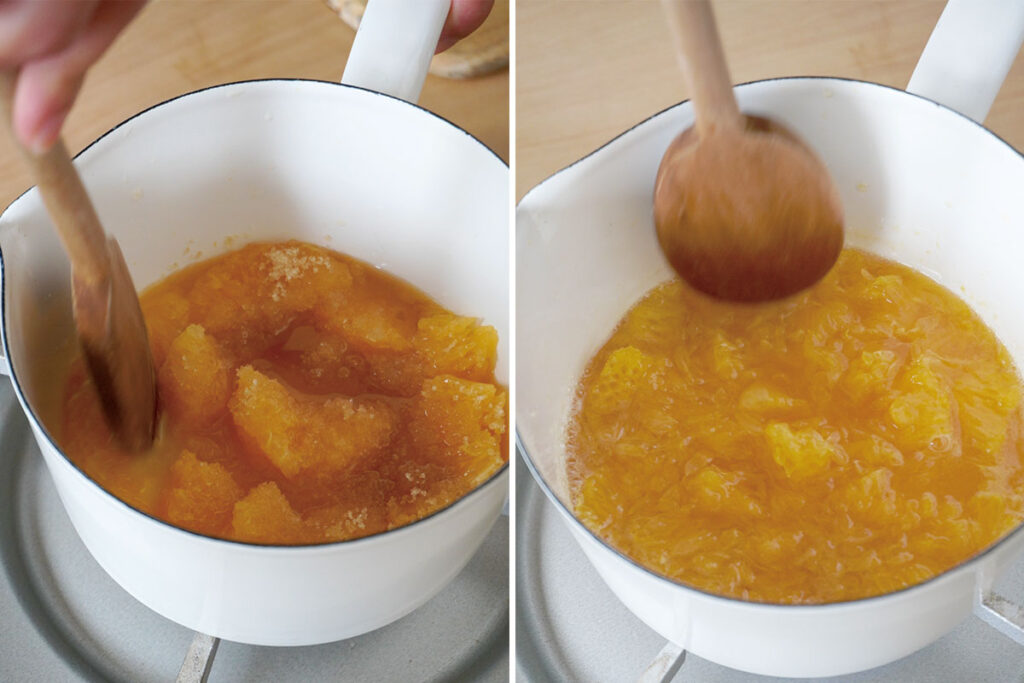 3)鍋に柑橘の果肉、果汁、グラニュー糖を入れて弱火にかけます。砂糖が溶けてとろみがでるまで7分ほど煮て、火を止めます。ボウルに移し、バターを加えて、泡立て器でよく混ぜ合わせます。