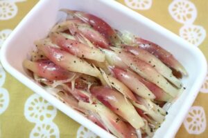 ②少し冷めたら、縦に1/4にカットして、ボウルで、塩・黒こしょう・米酢と和えて、