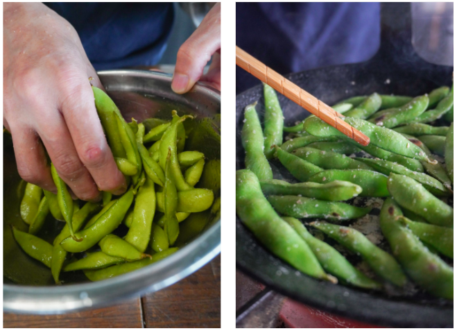 1)枝豆は水洗いし、塩をふって揉みこみます。塩がなじむまで5~10分ほど置きます。