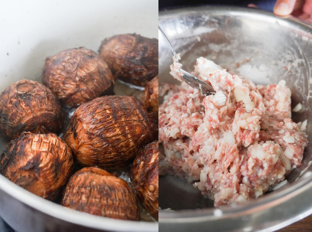 3)さといもは皮をむき、ボウルに入れてマッシャーまたはフォークでつぶします。すべての材料を加えて混ぜ合わせます。