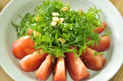 きんきんに冷やしたトマトに塩もみしたにんじん葉をのせて、にんにくをカリカリに焦がしたオリーブオイル。