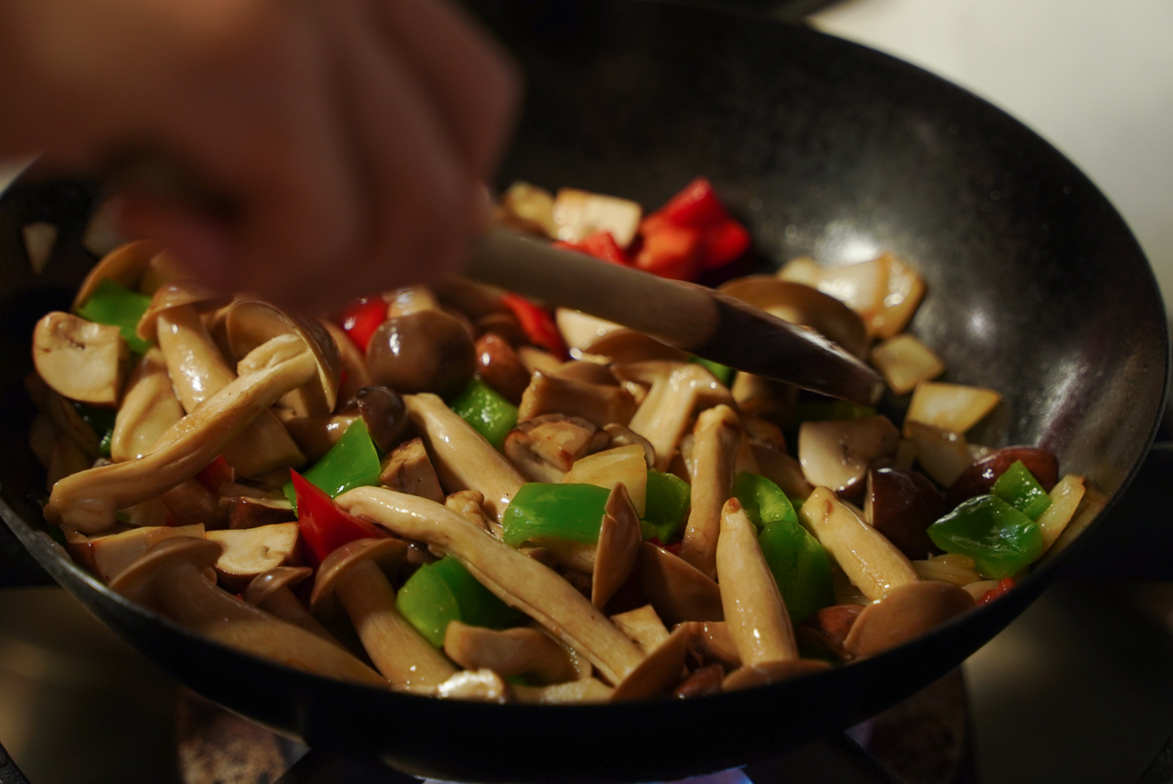 2)フライパンにバター(半量)を溶かし、玉ねぎ、はたけしめじ、マッシュルームを炒めます。つづいて、ピーマン、赤ピーマンを加えて炒めます。塩、こしょう(少々)で味付けし、火を止めます。