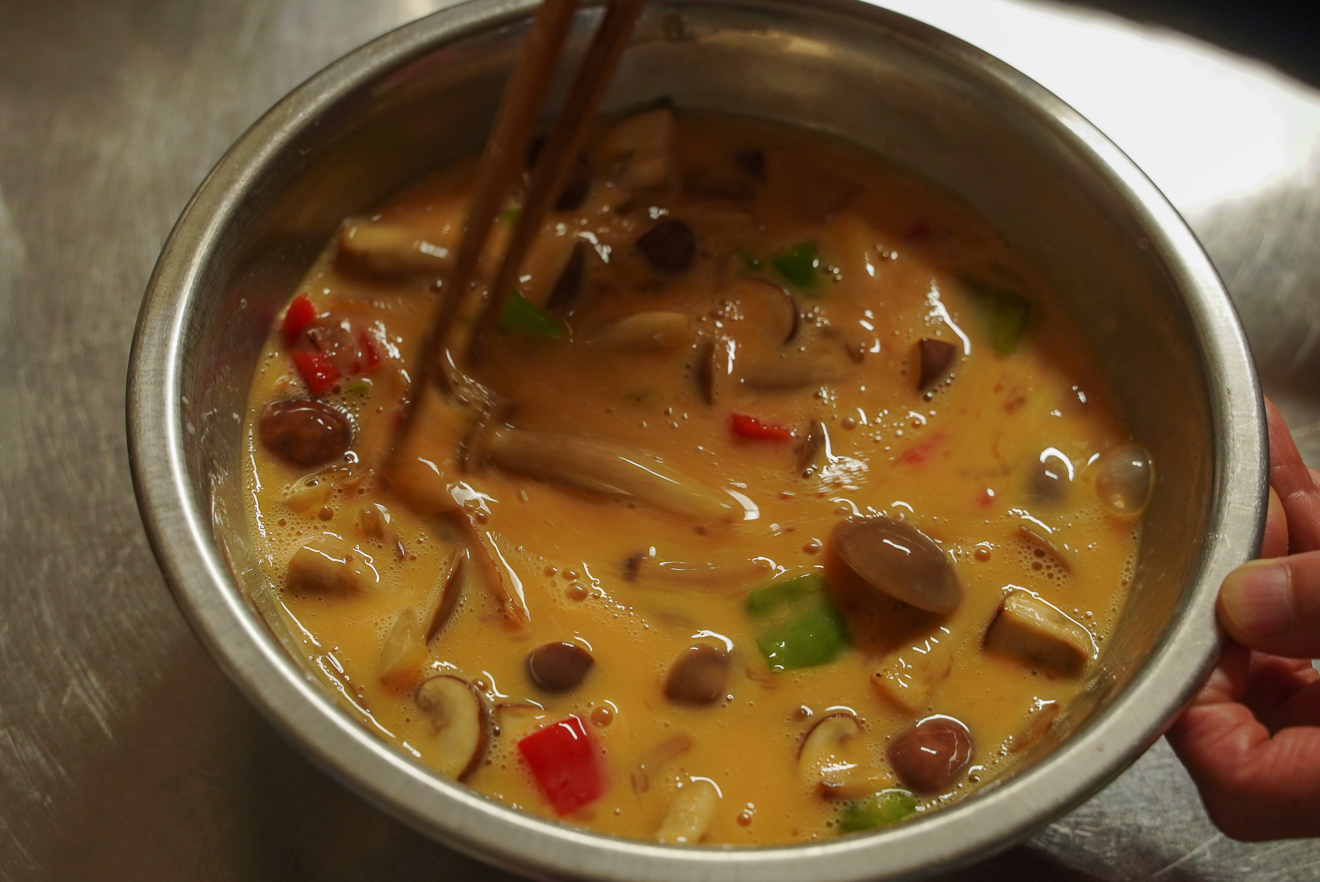 1)玉ねぎ、ピーマン、赤ピーマンは約1cm角に切ります。はたけしめじは石づきを除いてほぐし、マッシュルームは4等分に切ります。卵は大きめのボウルに割り入れ、溶いておきます。