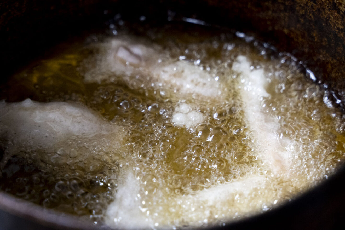 4)たけのこを衣にくぐらせ、180度の油でからっと揚げます。