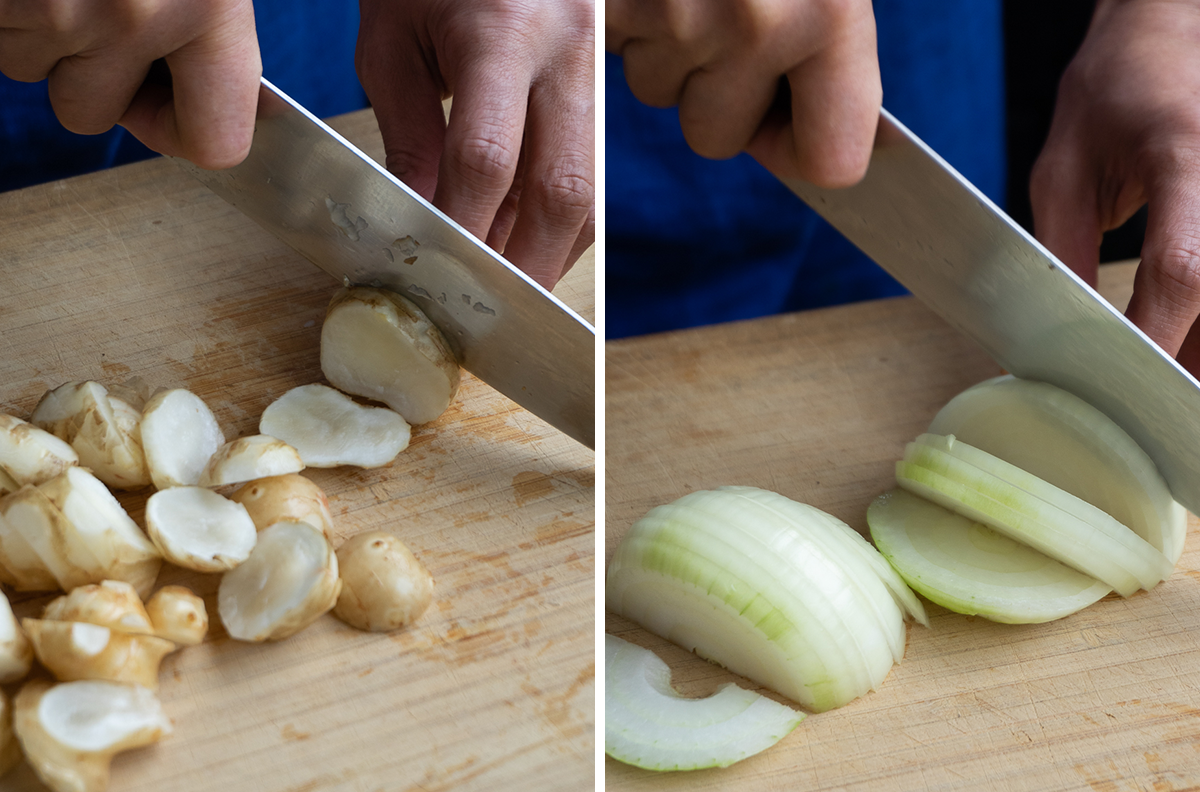 1)きくいもは、黒ずみが気になる場合は軽く取り除き、1cmほどの厚さに切ります。玉ねぎは繊維を断つように5mm幅にスライスします。
