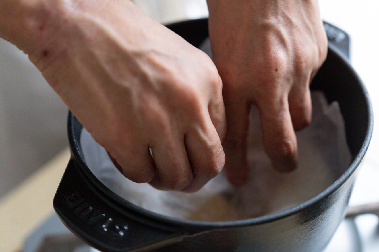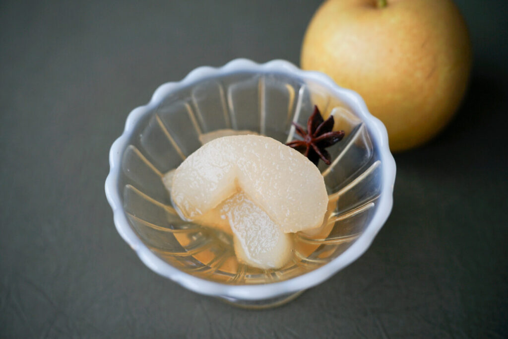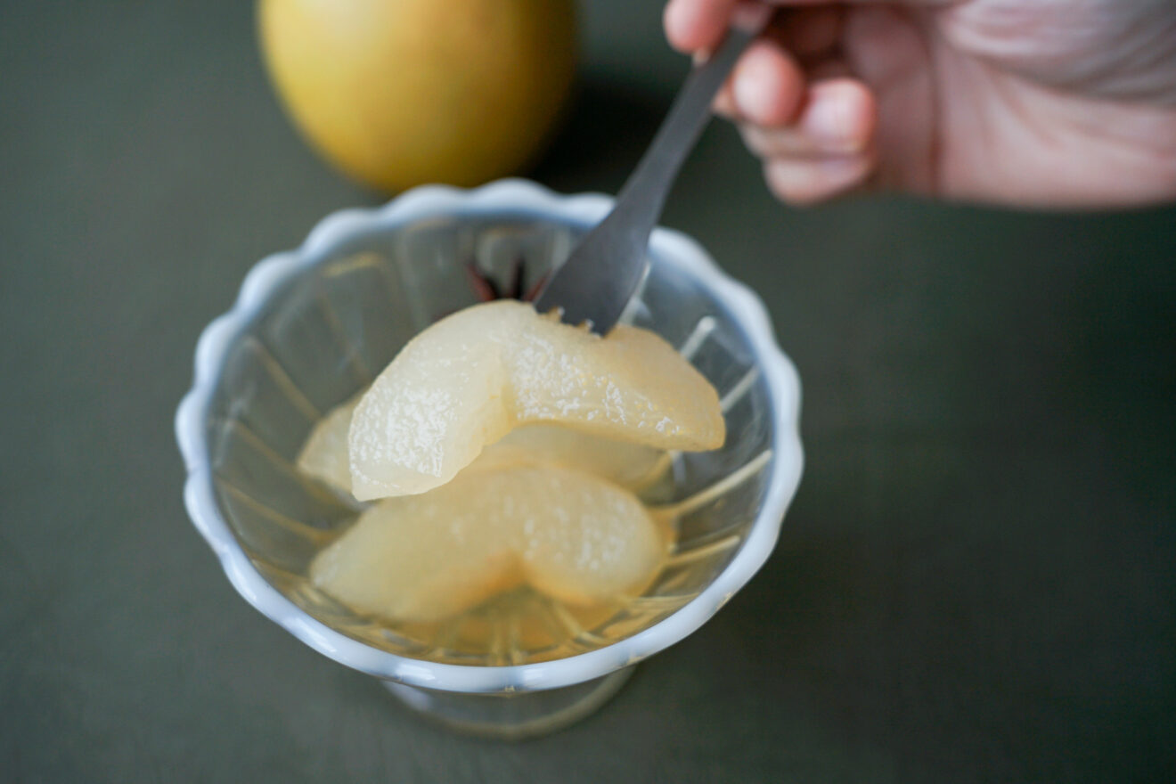 3)梨に竹串がすっと通り、少し透き通るくらいまで煮込んだら、火を止めてそのまま冷まします。粗熱がとれたら冷蔵庫へ。一晩おくと、より味がなじみます。