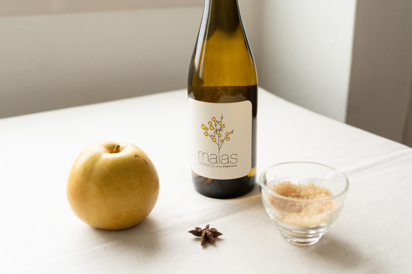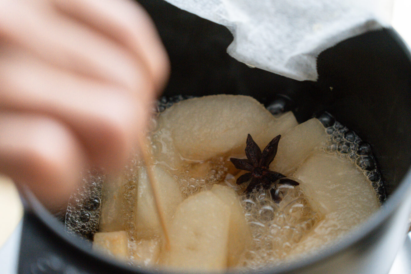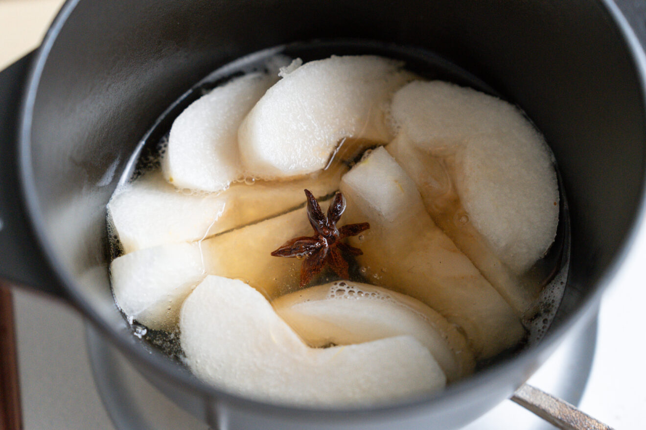 2)鍋に白ワイン、水、砂糖、スターアニスを入れ、火にかけます。煮立ったら弱火にして、梨を加えます。クッキングシートなどで落し蓋をして、20分ほど煮ます。