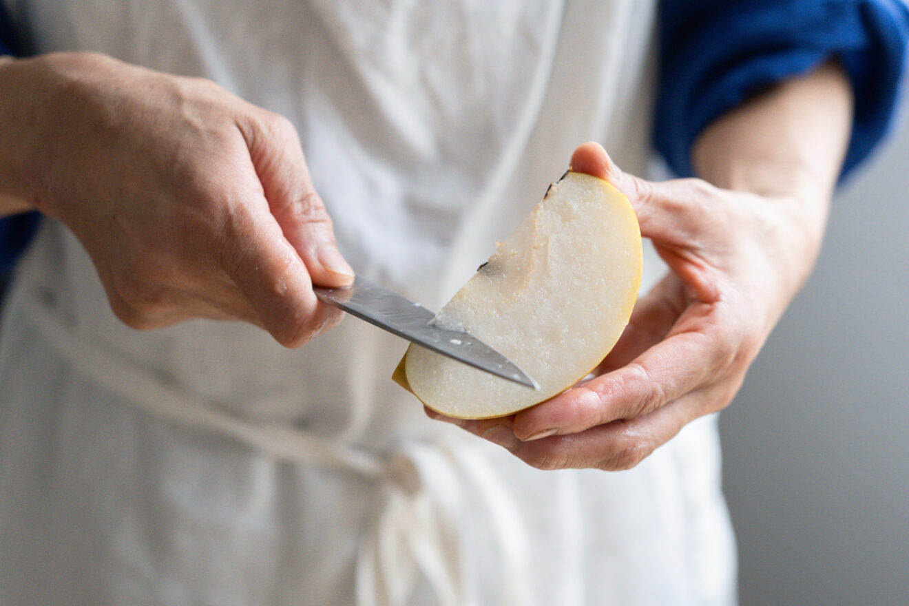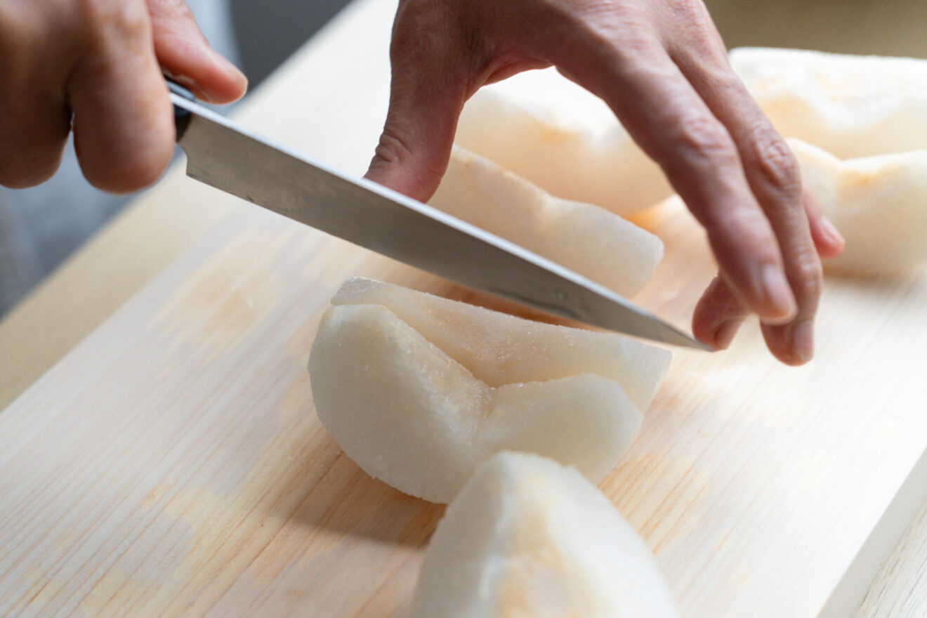 1)梨は皮を剥いて芯を取り除き、くし切りにします。