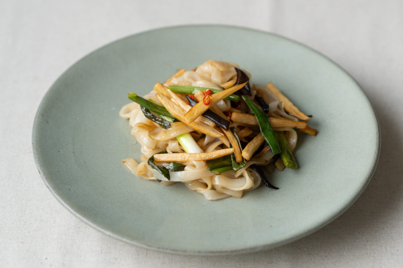 蒸し焼きにした白米麺は、もっちりとした食感に。お酢としょうゆでさっぱりと仕上げます。