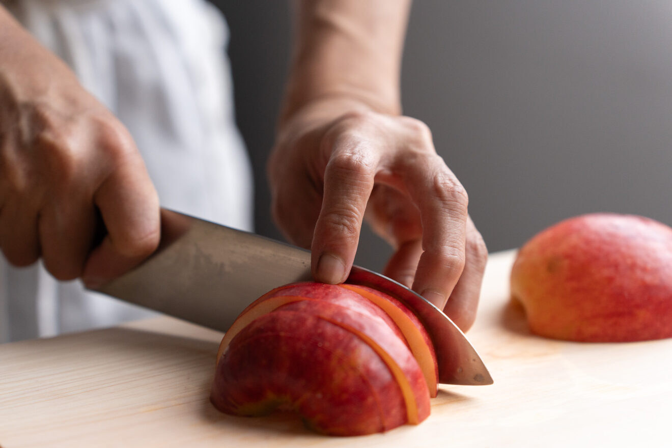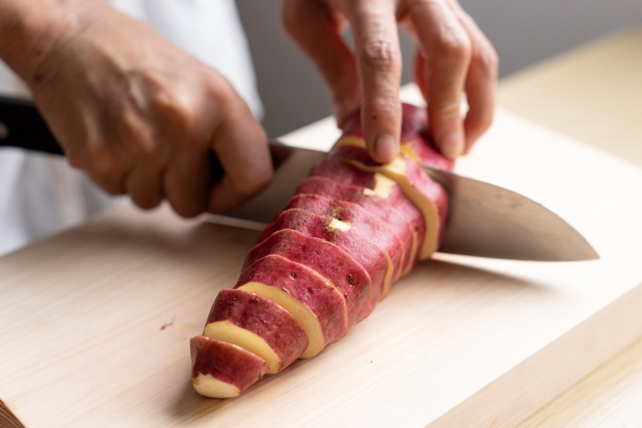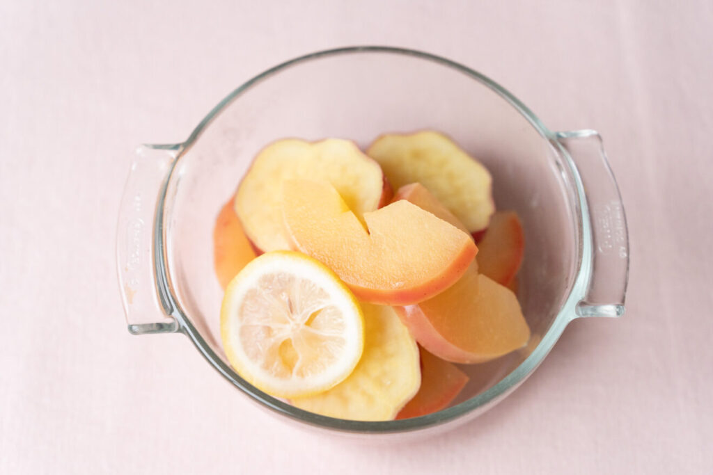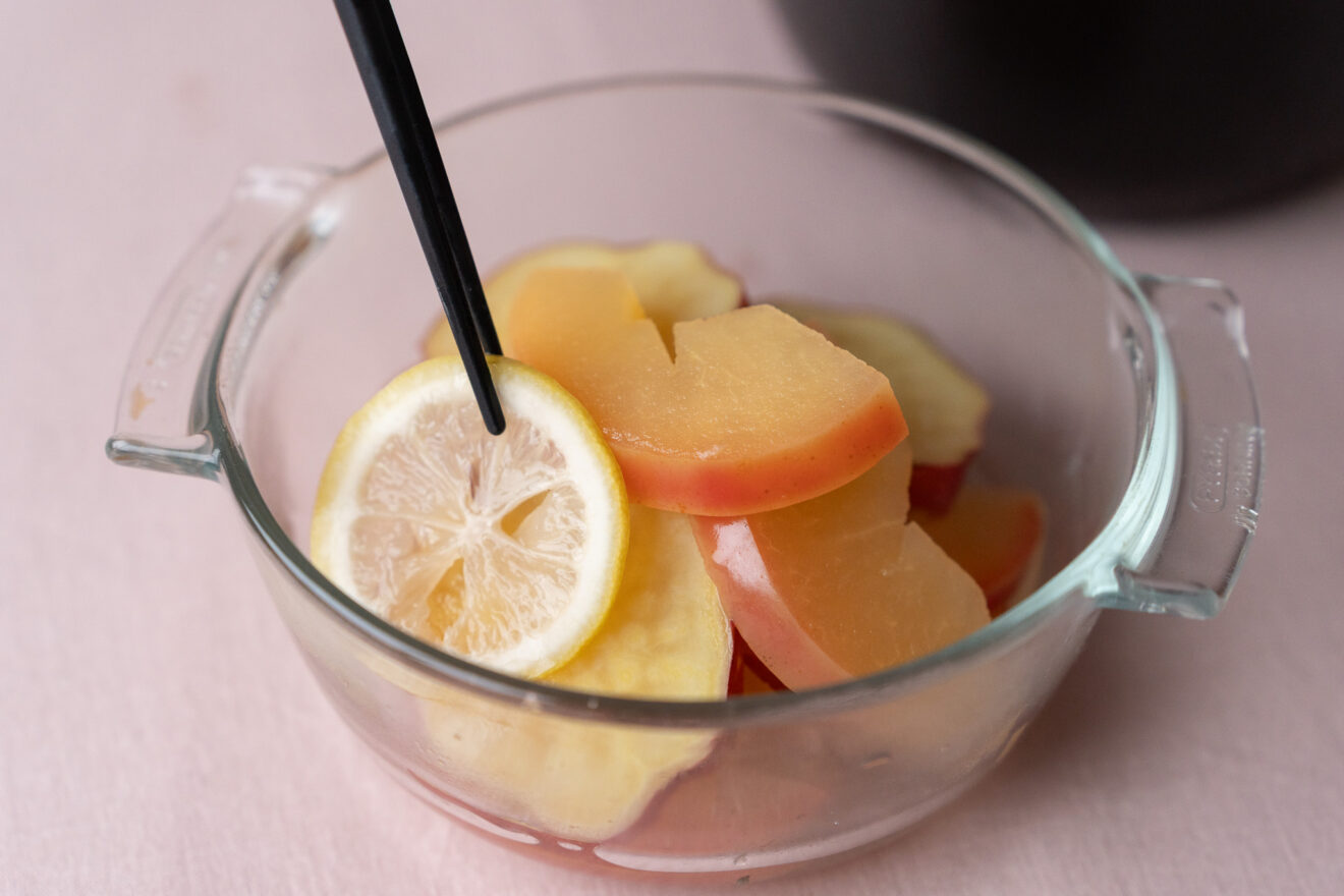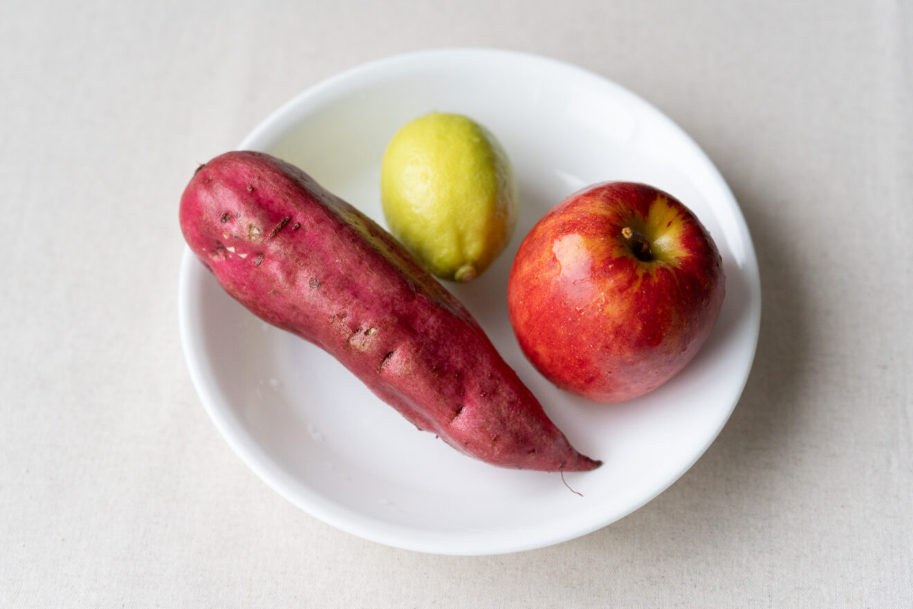 1)さつまいもは輪切りにします。りんごは半分に切って芯を取り除き、1cm厚さの半月切りにします。