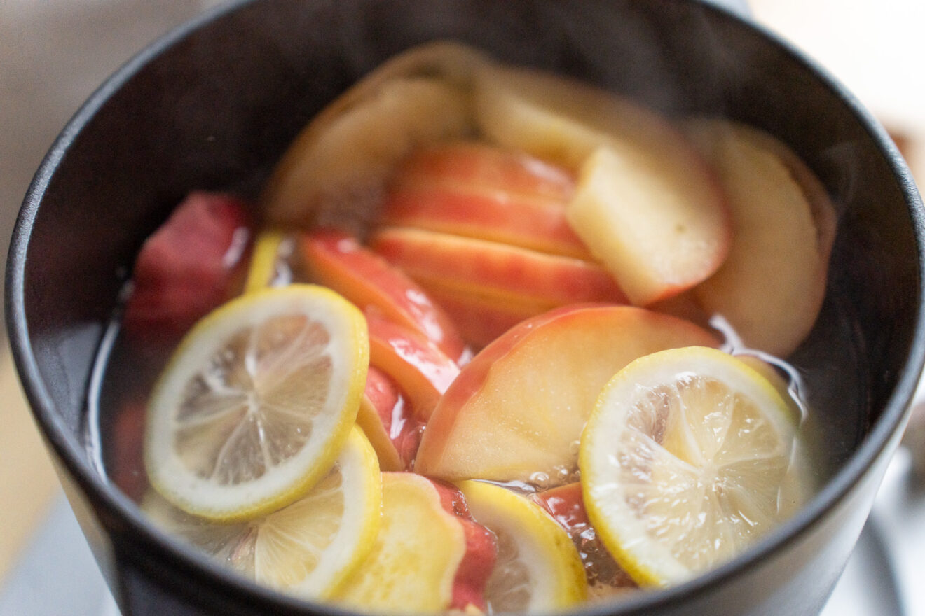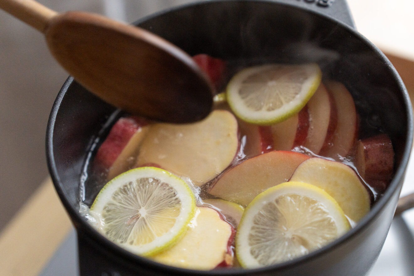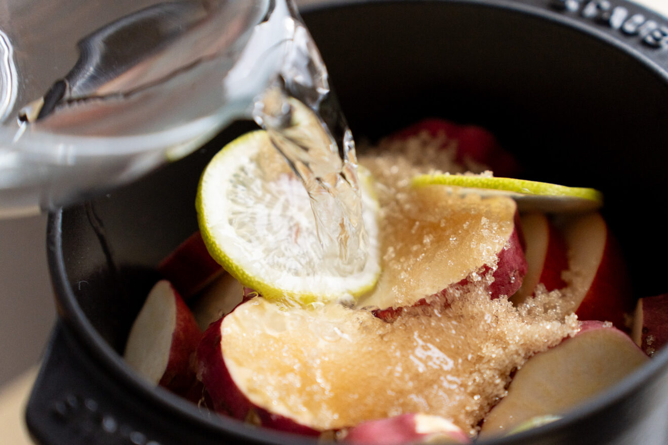 2)鍋にさつまいもとりんごを重ね入れ、レモンをのせます。砂糖と、ひたひたの水を加え、火にかけます。