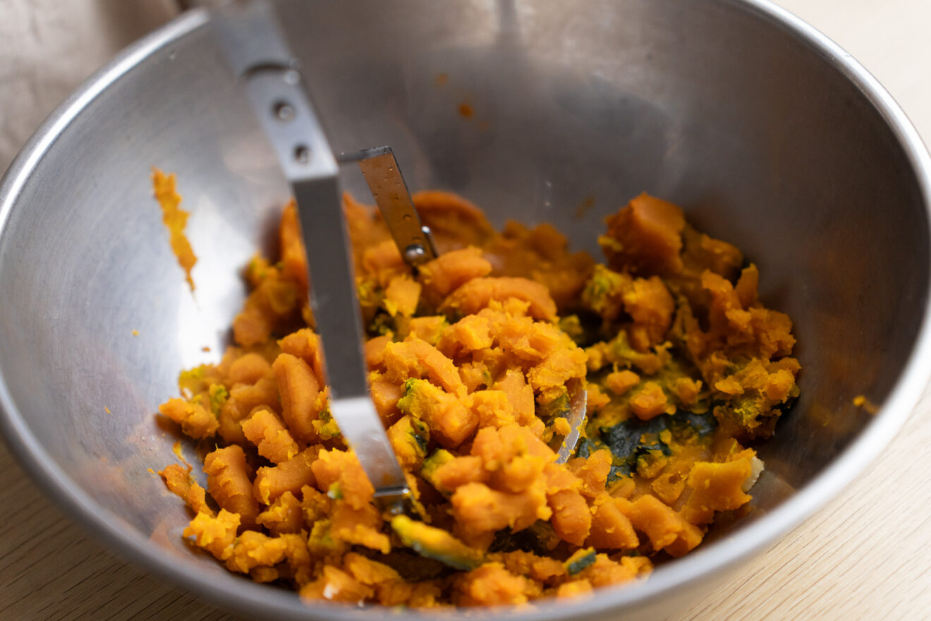3)ボウルにかぼちゃを移し、マッシャーやフォークなどで潰します。