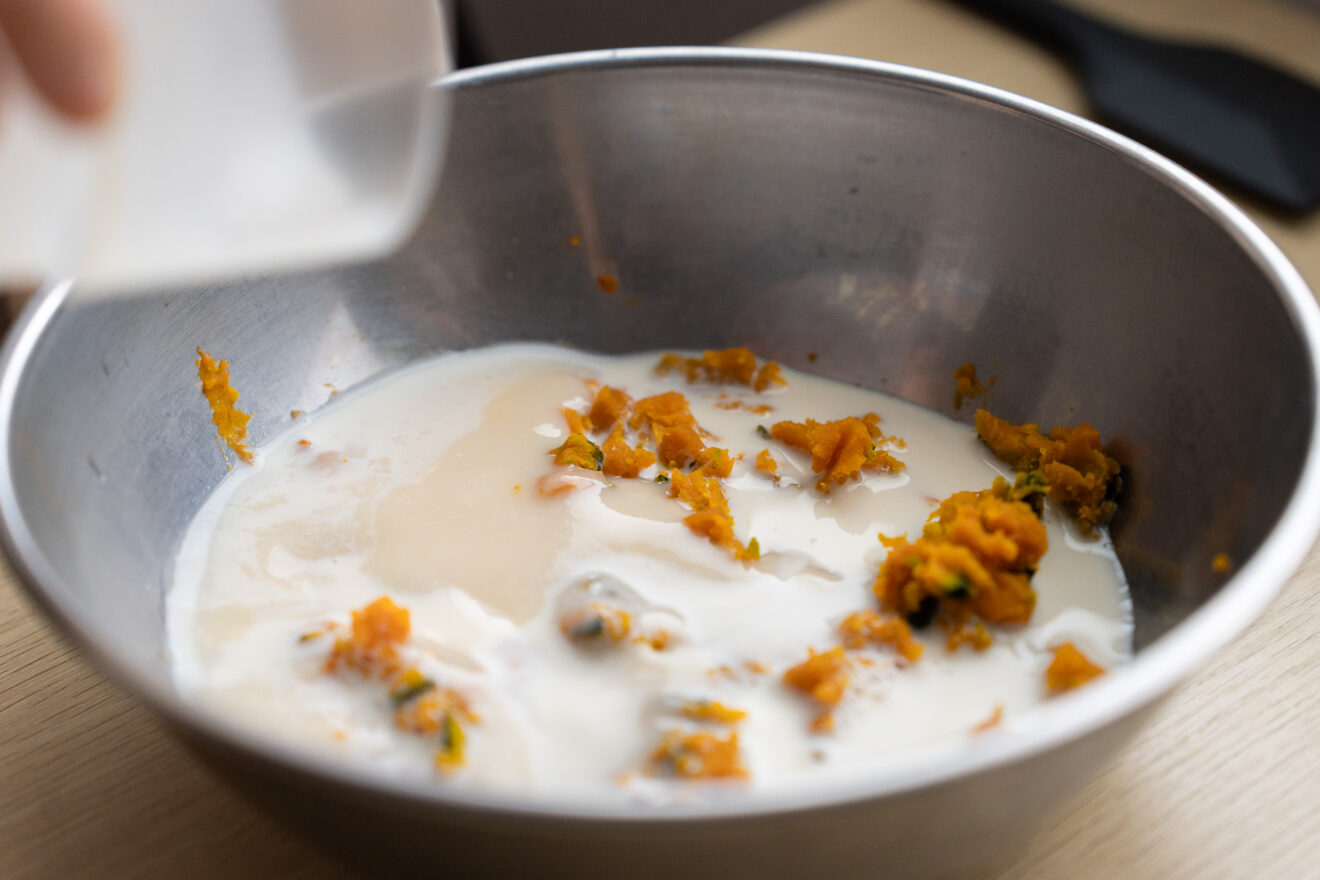 4)3に濃縮甘酒、豆乳を加え、かぼちゃを軽く潰しながら混ぜます。