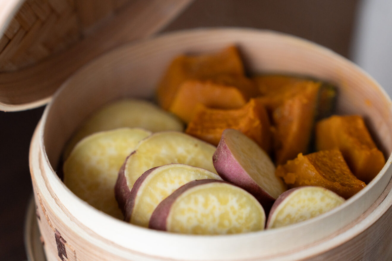 2)蒸気の上がった蒸し器にさつまいもを入れ、約20分蒸します。