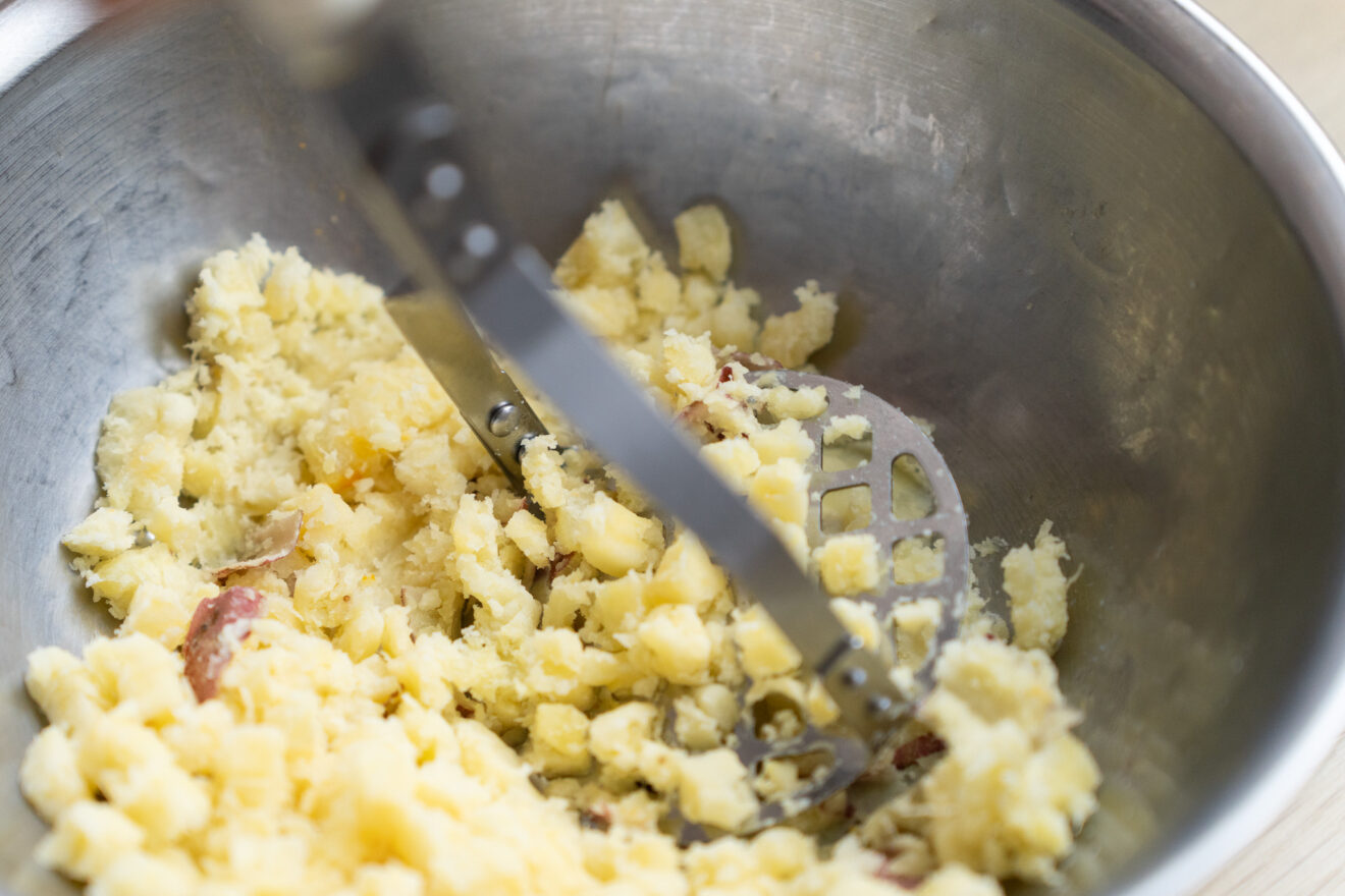 3)ボウルにさつまいもを移し、マッシャーやフォークなどで潰します。