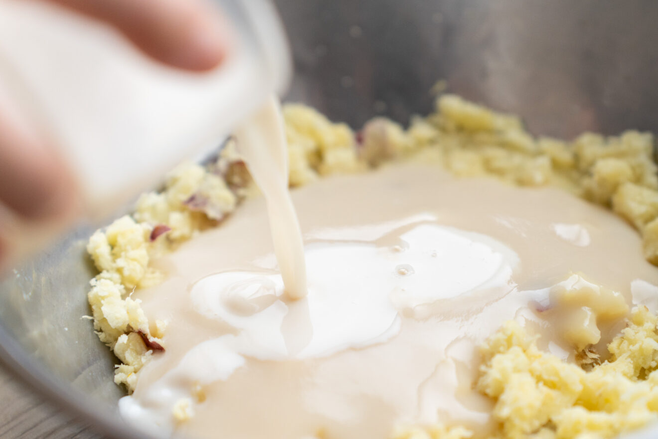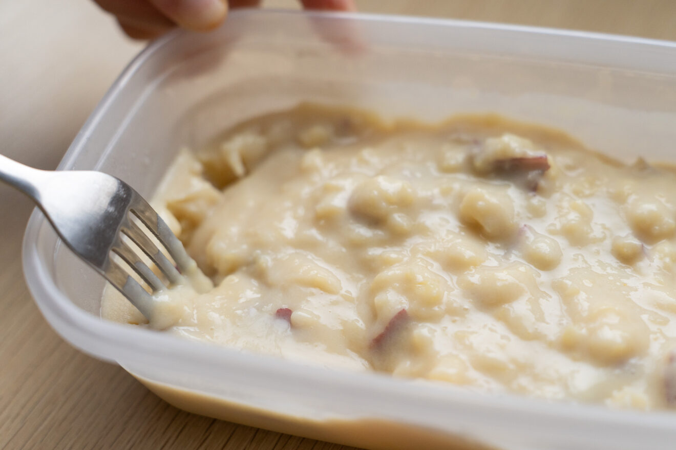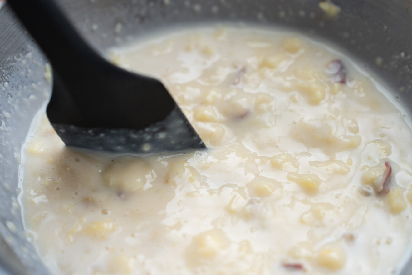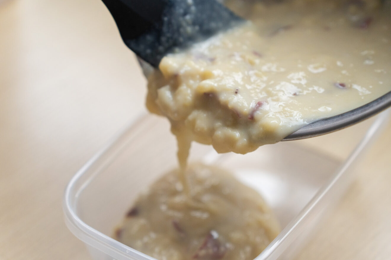 4)3に濃縮甘酒、豆乳を加え、さつまいもを軽く潰しながら混ぜます。