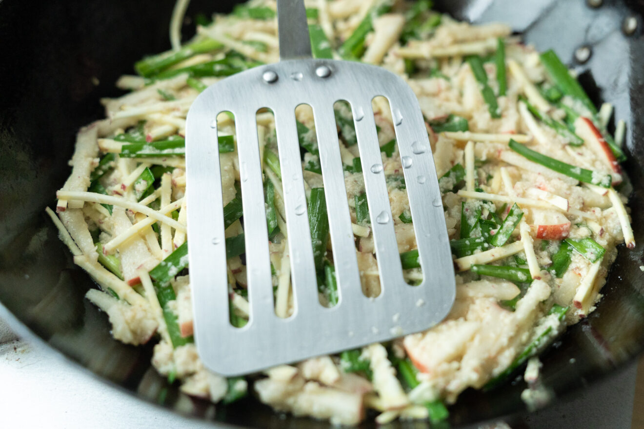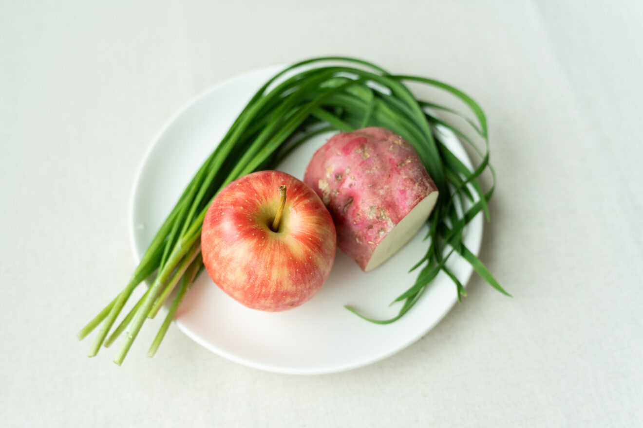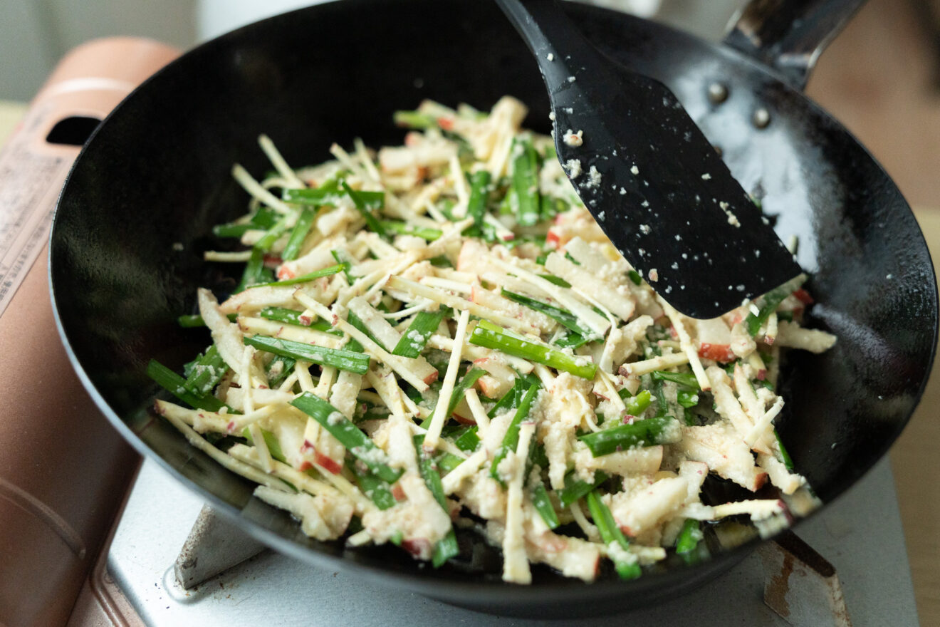 さつまいもがおかずの主役になる、カリッと香ばしい一品です。りんごの甘酸っぱさとニラの香りがよく合いますよ。