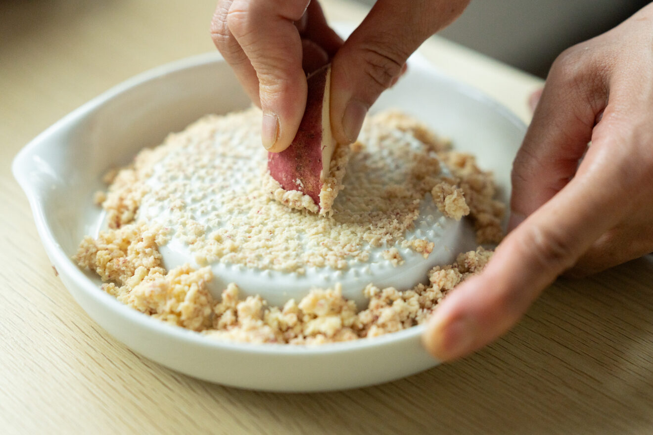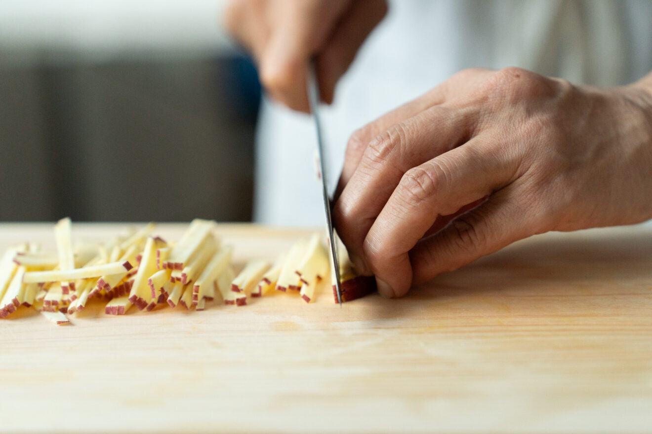 1)さつまいもは、半分を細切りにし、もう半分をすりおろします。