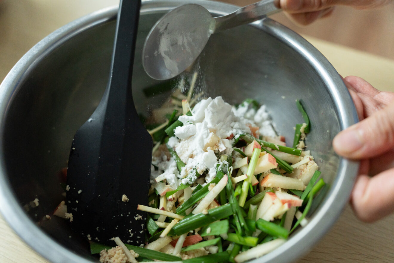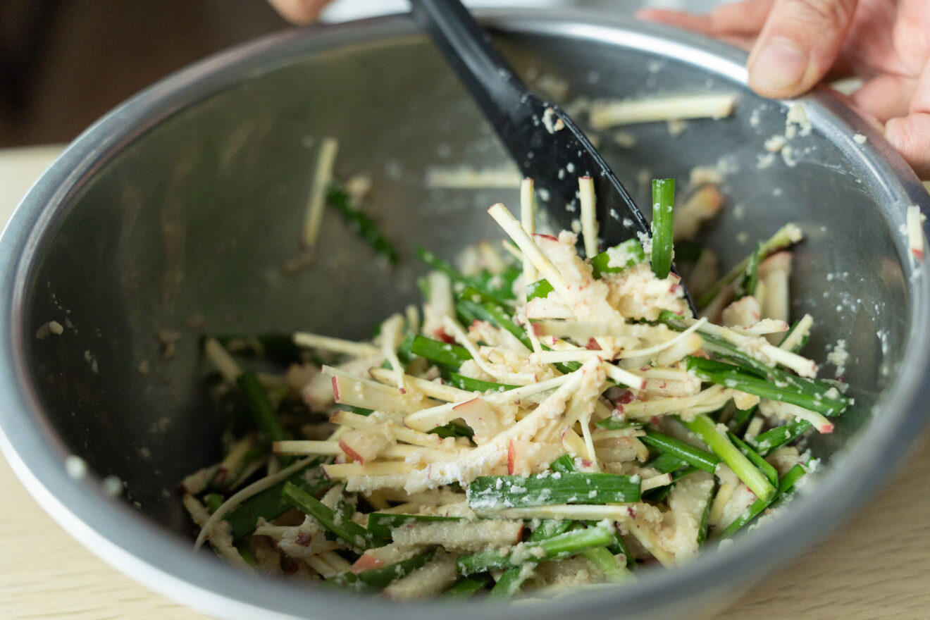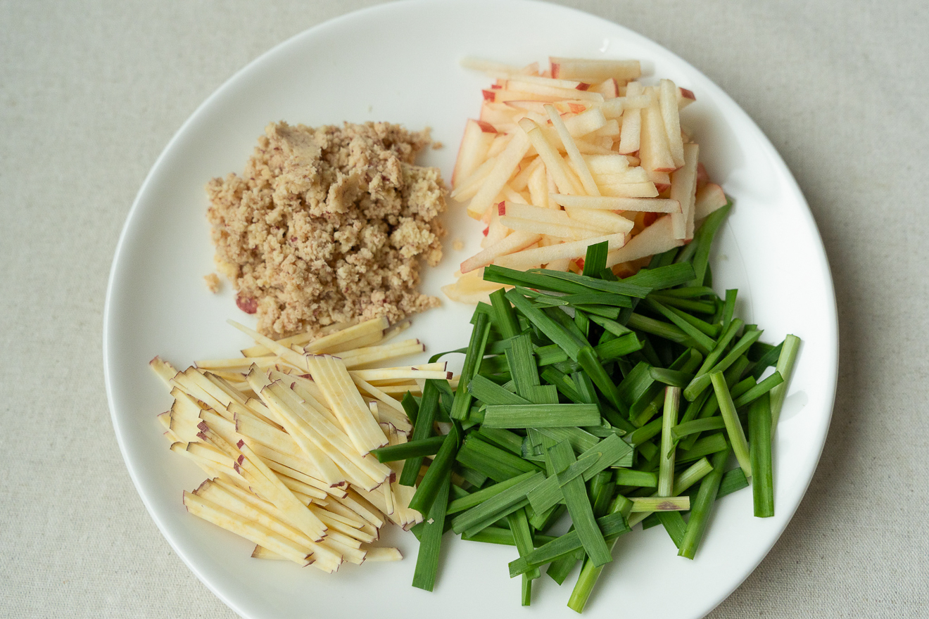 りんごは5mm幅くらいの細切りに、ニラは4cmの長さに切ります。