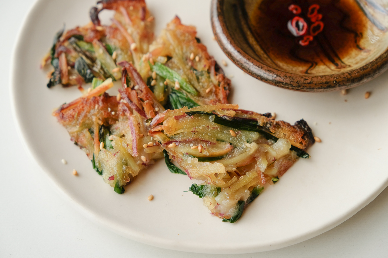 ニラのチヂミに、カリッと香ばしいさつまいもと、甘酸っぱい焼きりんごの風味が加わったような、たのしい味わいです。タレには唐辛子を加えるのがおすすめ。さつまいもやりんごの甘みと、唐辛子の辛みのバランスがとれておいしいです。