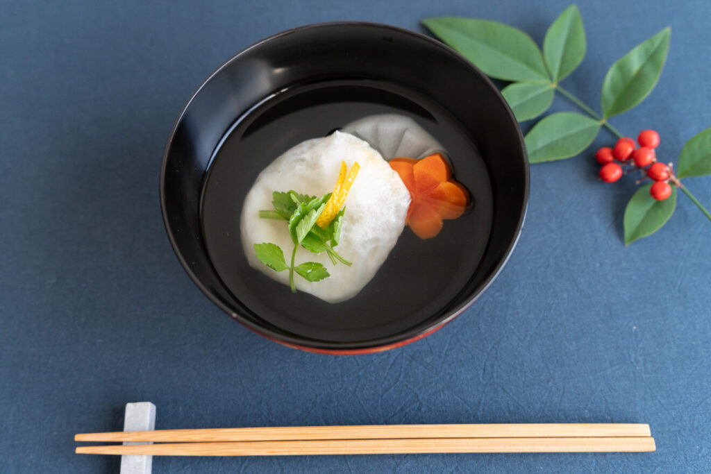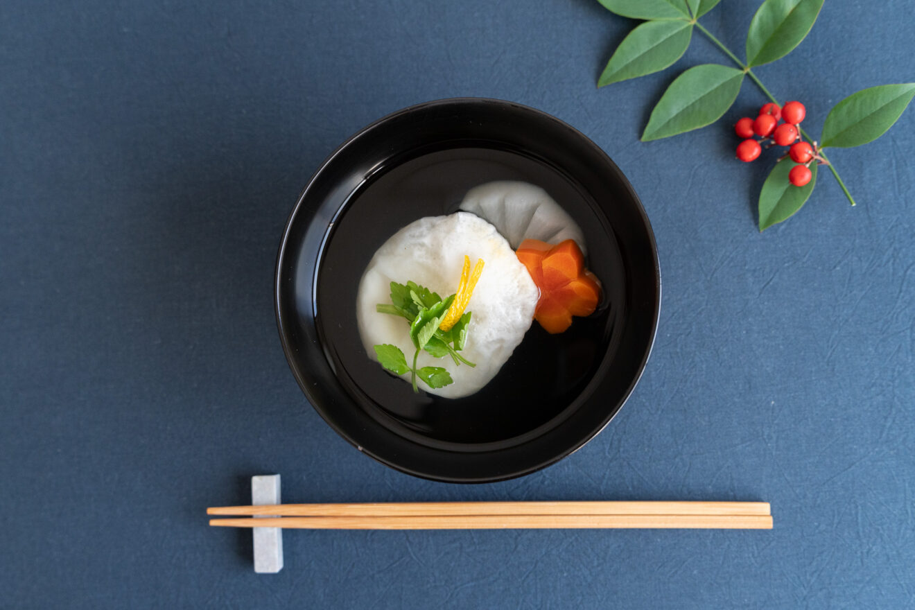 上品なかつお昆布だしが香る、すまし仕立てのお雑煮。丸もちに、大根、にんじん、せり、ゆずを合わせました。お好みの具材でどうぞ。