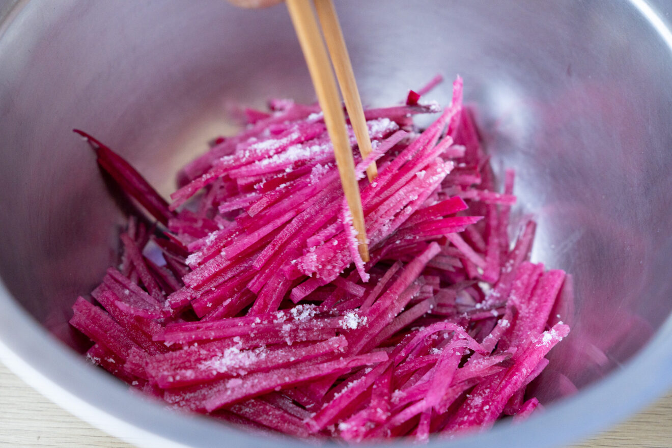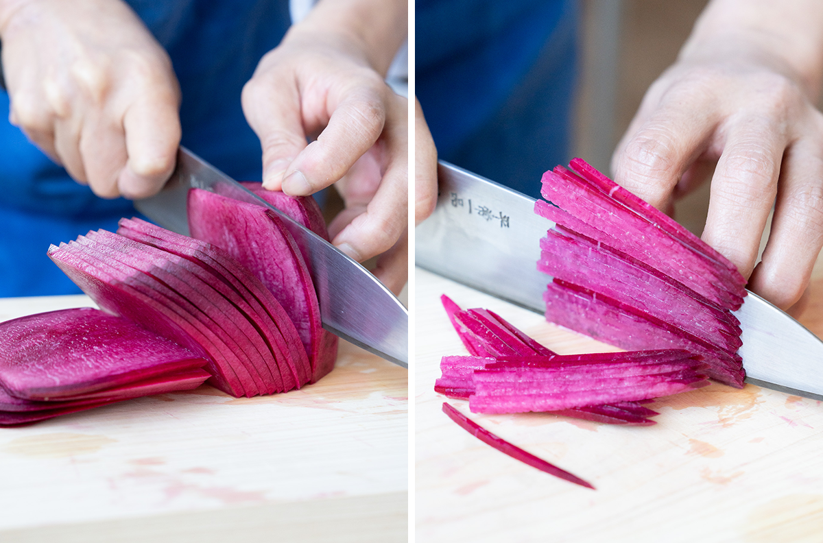 1)紅だいこんは6~7cmの長さに切り、皮を剥きます。縦に2mm幅の薄切りにし、重ねてさらに2mm幅の千切りにします。