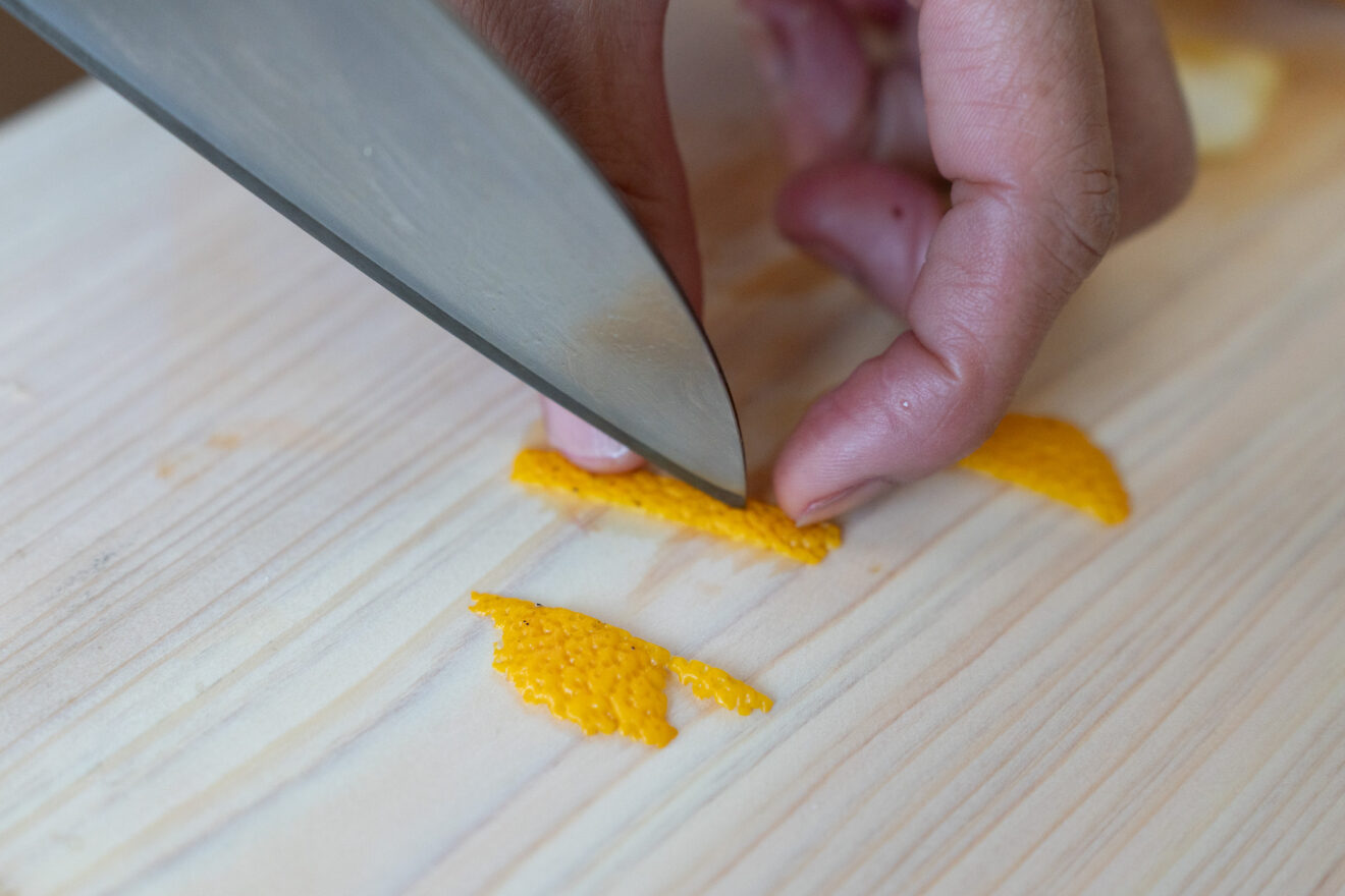 飾りのゆずの皮は、2~3cmの棒状に切り、片端を残して真ん中に切れ目を一筋入れます。