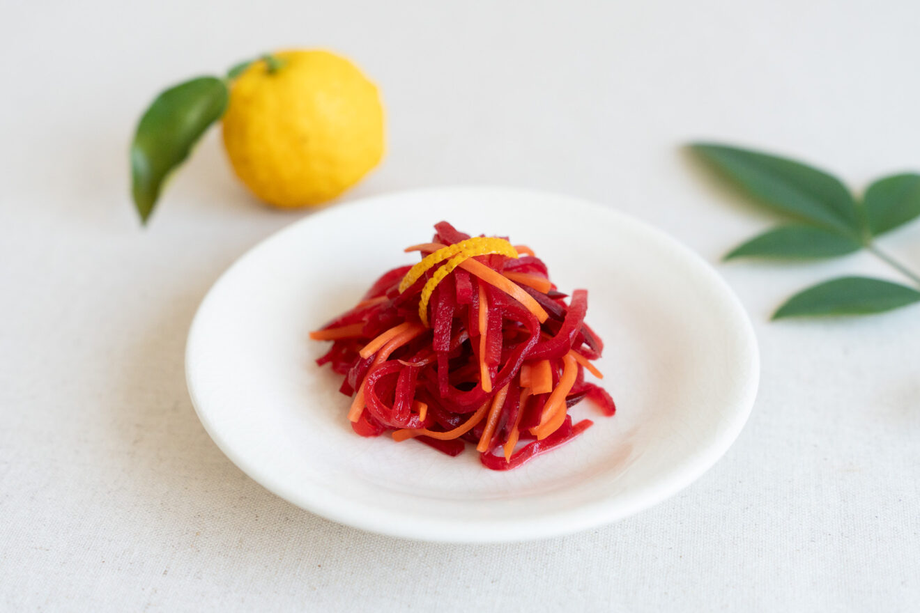 色あざやかな紅だいこんでつくる、酢の物。にんじんと二色にしても。おせち料理を彩ります。