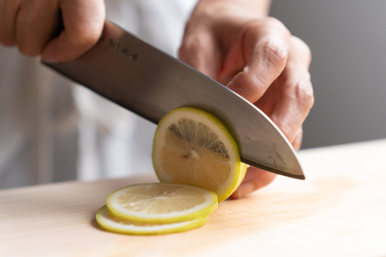 1)レモンは洗って水気を拭きます。ヘタを落として、薄切りにし、種は取り除きます。